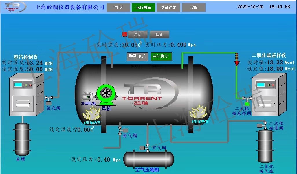 4.電氣自動控制系統(tǒng)含自動進(jìn)蒸汽流量閥、自動進(jìn)CO2流量閥、自動排氣泄壓閥、電磁閥、氣路、溫度傳感器、濕度傳感器、壓力傳感器、CO2濃度傳感器、電器控制箱、空氣壓縮機(jī)、CO2減壓閥、降溫水冷系統(tǒng)等配件