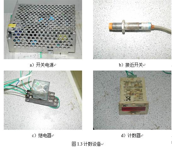 計(jì)數(shù)設(shè)備由開(kāi)關(guān)電源、繼電器、計(jì)數(shù)器和接近開(kāi)關(guān)組成,各部分見(jiàn)圖1.3。在偏心輪上粘貼一塊鐵片或者鋁片(見(jiàn)圖1.2(c)),當(dāng)鐵片或者鋁片經(jīng)過(guò)接近開(kāi)關(guān)時(shí),繼電器被觸發(fā),計(jì)數(shù)器數(shù)字增大一個(gè),如此來(lái)記錄偏心輪轉(zhuǎn)動(dòng)的圈數(shù),即加載次數(shù)。